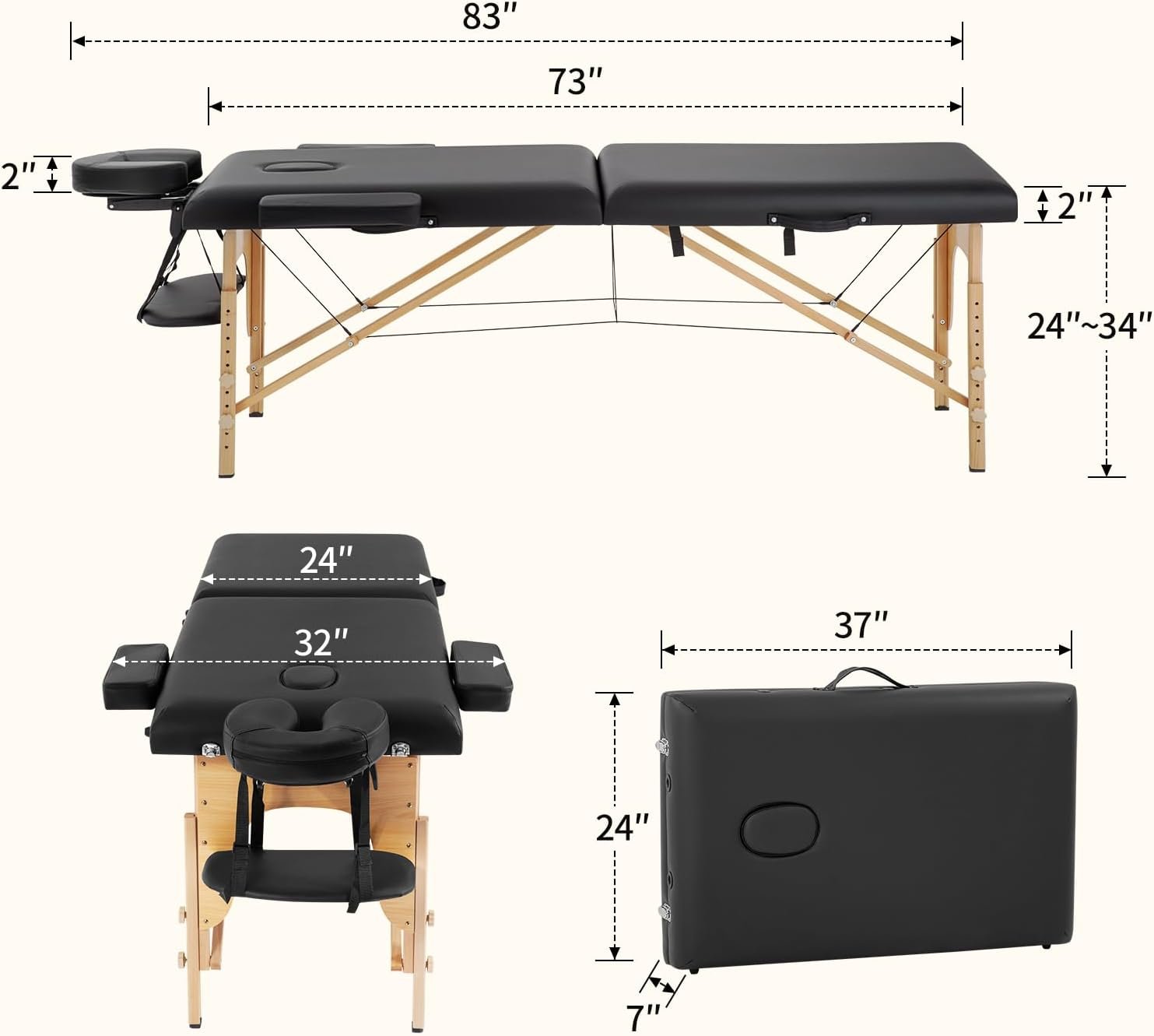 - Adjustable height: Effortlessly tailor the folding table for each client with height adjustable legs (24″ to 34″), a necessity for customizable spa bed ergonomics.
