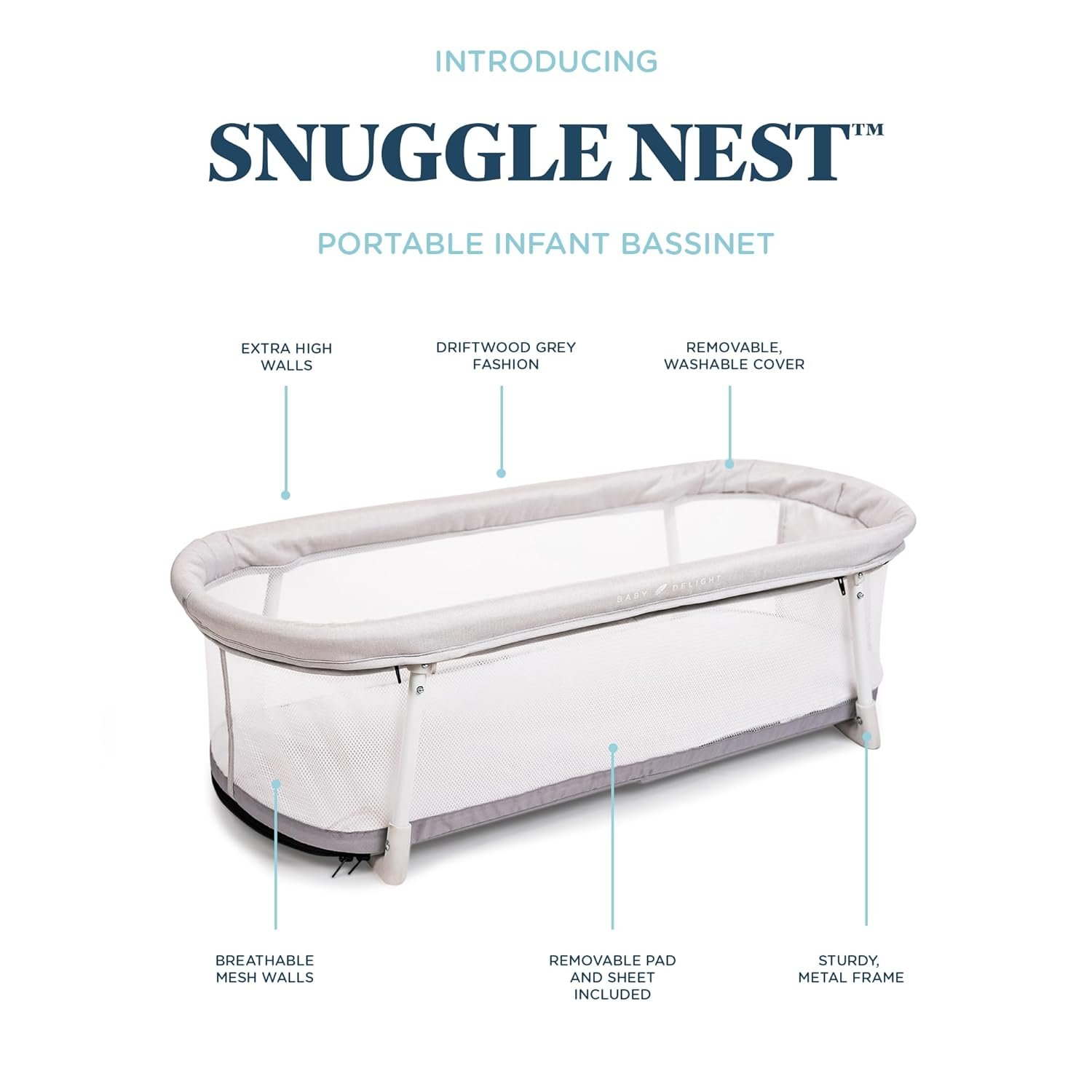 The Baby Delight Snuggle Nest Bassinet is an essential portable baby bed, perfect for infants 0-5 months. It offers maximum safety with a sturdy, JPMA-certified design, breathable comfort-mesh walls, and a soft mattress for your little one. Plus, its lightweight, foldable design and machine-washable components make it incredibly convenient for busy parents on the go.