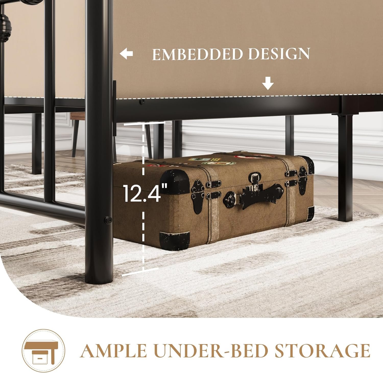 Experience restful nights and maximized space with the SHA CERLIN 14" Queen Size Metal Platform Bed Frame. This elegant black frame boasts a sturdy Victorian-style headboard and footboard, an 800 lb capacity, and 12.4 inches of under-bed storage, eliminating the need for a box spring while providing noise-free support.