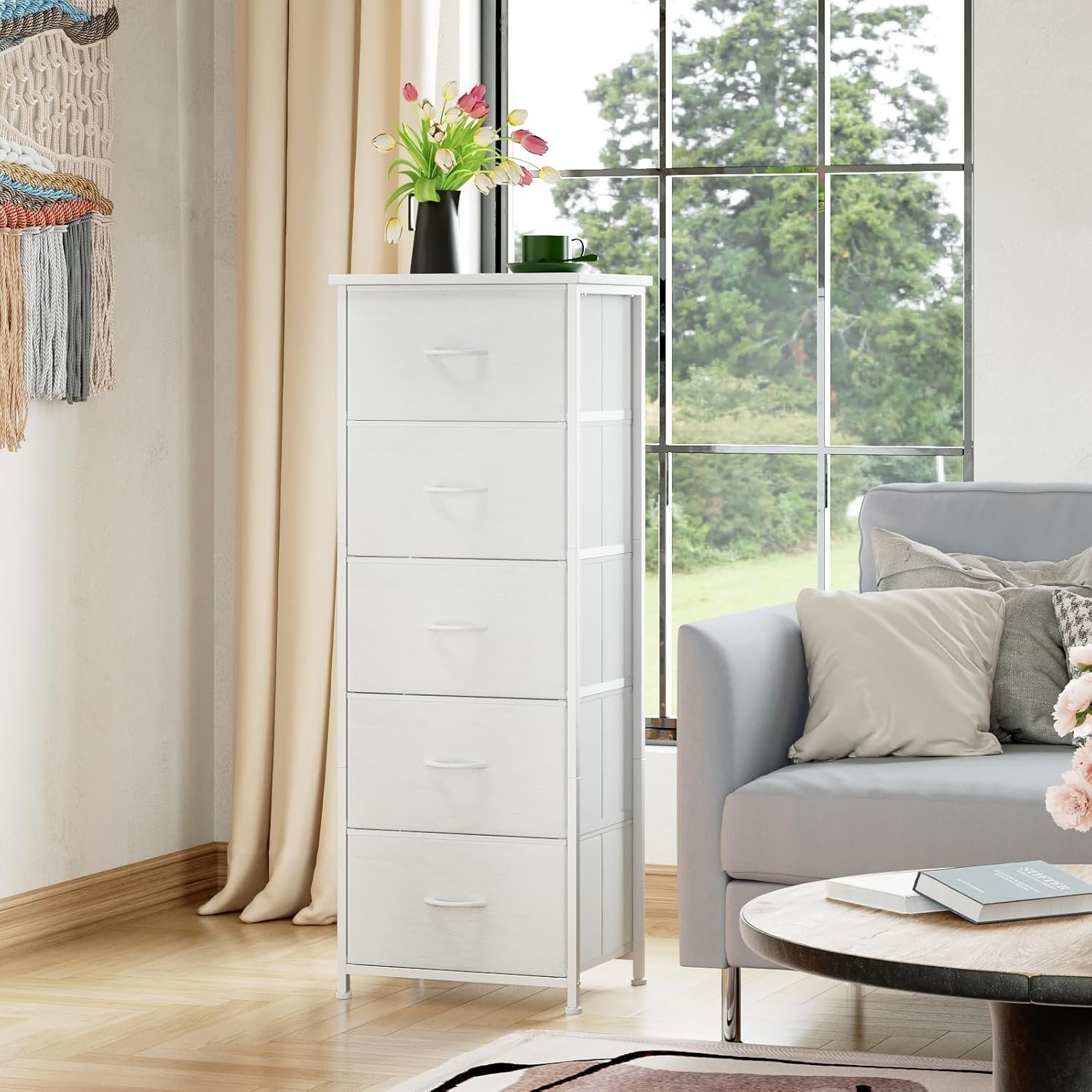 The Somdot Tall Dresser is a stylish and versatile 5-drawer storage organizer, perfect for decluttering any space. Boasting a durable steel frame, non-woven fabric drawers with a chic white leather finish, and an eco-friendly design, this easy-to-assemble chest offers modern appeal and ample storage for bedrooms, living rooms, nurseries, and more.