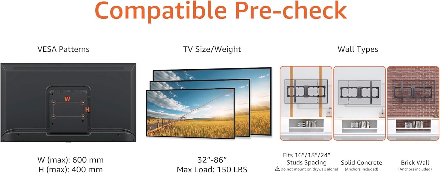 • **Universal Compatibility:** This TV mount is designed for TVs up to 150 lbs (68 KG) and display sizes ranging from 32″ to a massive 86″ (81.3 CM – 218 CM). It’s also VESA compatible, supporting sizes from 200×100 MM through 600×400 MM, making it suitable for a vast array of television models.